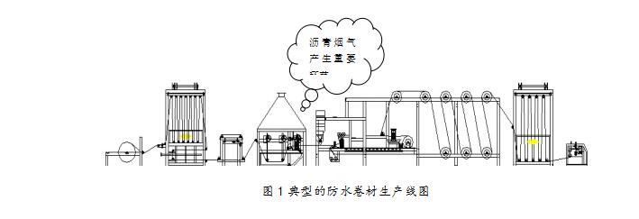 通過現(xiàn)場勘察和設(shè)計經(jīng)驗,現(xiàn)場煙氣及粉塵的來源主要有兩個部分,一是原料儲存及攪拌罐頂部排氣孔的無組織排放,二是防水卷材的浸涂、覆膜、撒砂、包裝工藝環(huán)節(jié)產(chǎn)生的高溫瀝青煙氣。