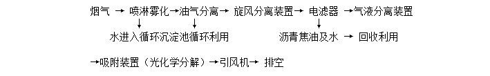 在引風(fēng)機的負(fù)壓作用下帶有粉塵物質(zhì)的瀝青煙氣經(jīng)過加裝噴淋頭的管道,經(jīng)過連續(xù)噴漆淋使煙氣中的油粒子和小粉塵等被沖洗下來、混溶于水中后流入冷卻循環(huán)水池,出來的煙氣經(jīng)油氣分離裝置去除部分油質(zhì)及水分后進入旋風(fēng)除塵除去部分不溶于水的焦粉等粉顆粒類物質(zhì),而后進入瀝青煙電濾器捕集掉剩余的油污及膠粉顆粒,處理后的氣體再經(jīng)過氣液分離裝置再次精細(xì)凈化,然后再進入吸附裝置或光化學(xué)分解裝置,除掉煙氣中的瀝青異味,凈化后煙氣通過煙囪排入大氣。